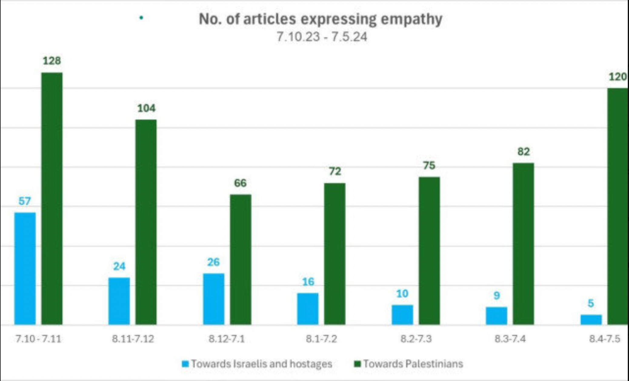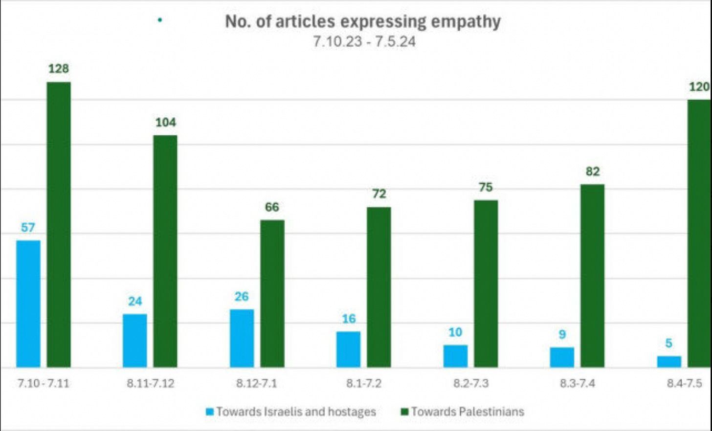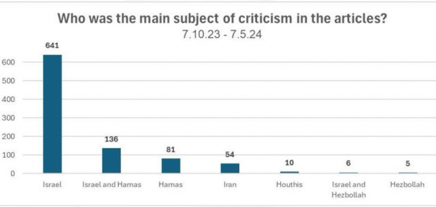 The bias of major news outlets regarding the war in Gaza has been obvious to anyone paying attention. A new analysis of The New York Times’s coverage since 10/7 looks at which side the coverage has focused criticism on and which side it has empathized with. I think the charts speak for themselves. Criticism of Hamas has virtually disappeared as if they are a non-entity in the conflict, while empathy for Israelis was mostly gone within weeks of the attack.
